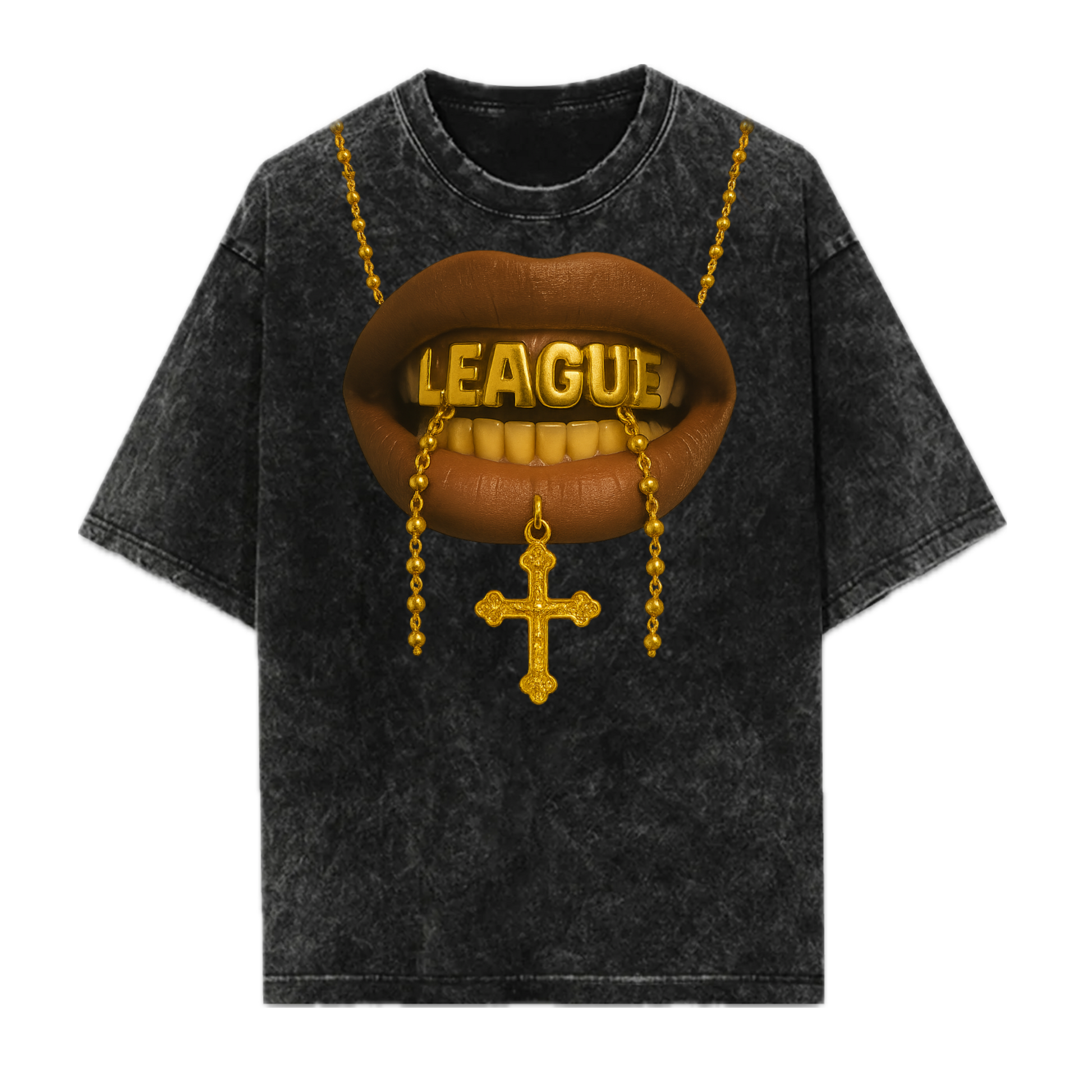 Pictured is our "Mouth of Gold" cotton, acid wash classic and durable fit t-shirt. The front features a mouth with a gold "League" grill and gold chains, back features our brand logo on the back of the neck in gold.