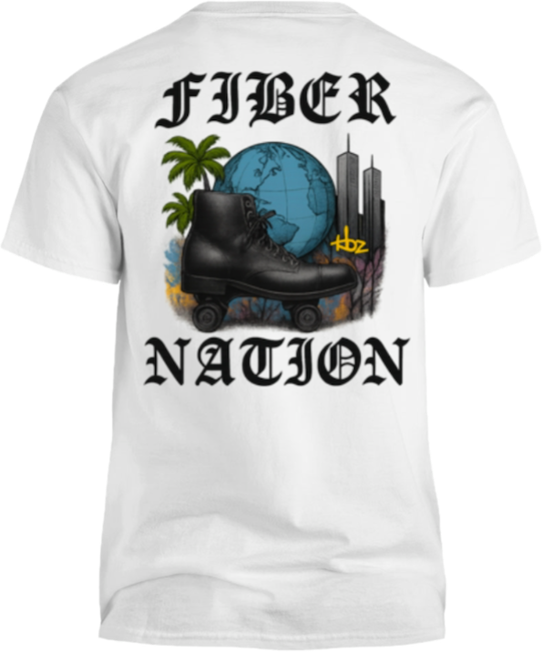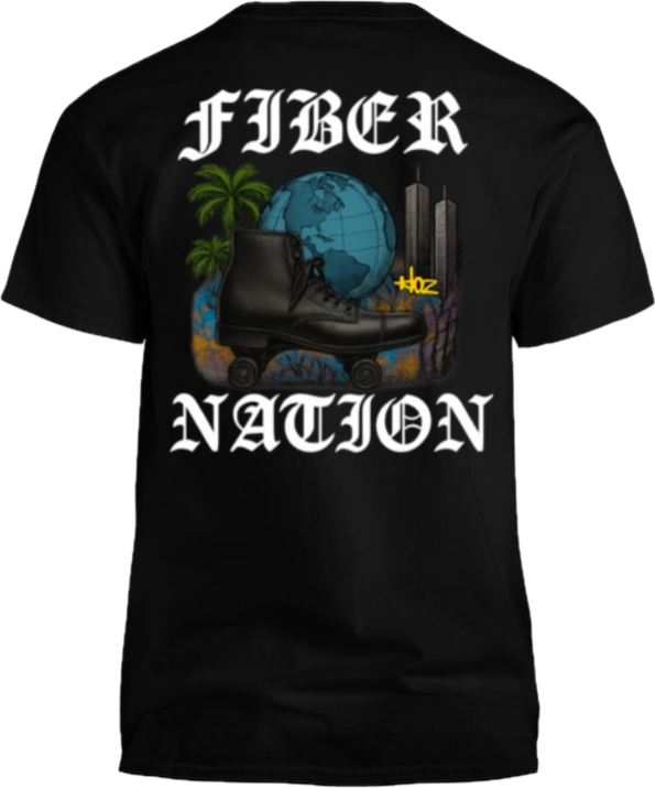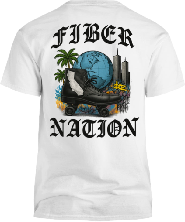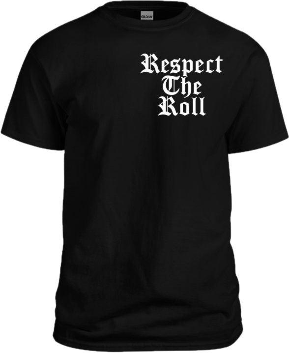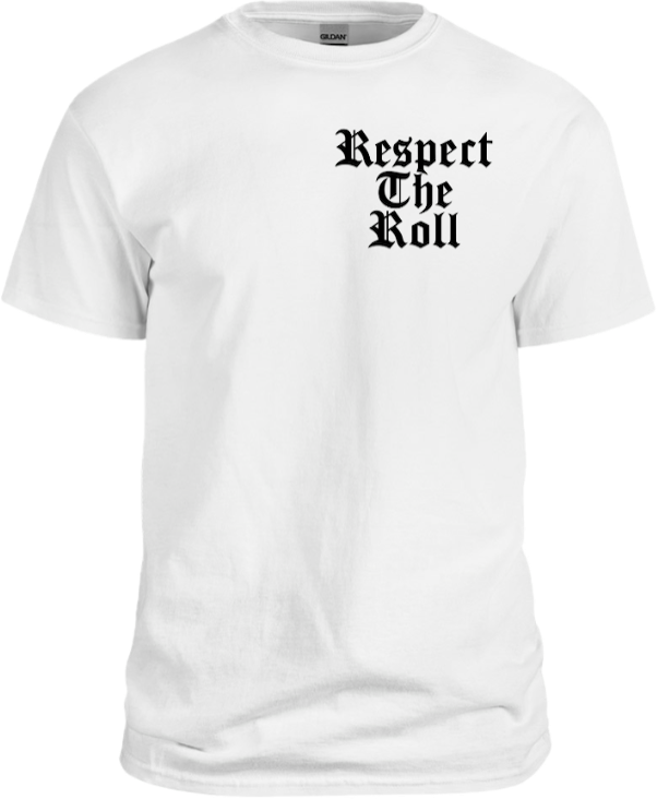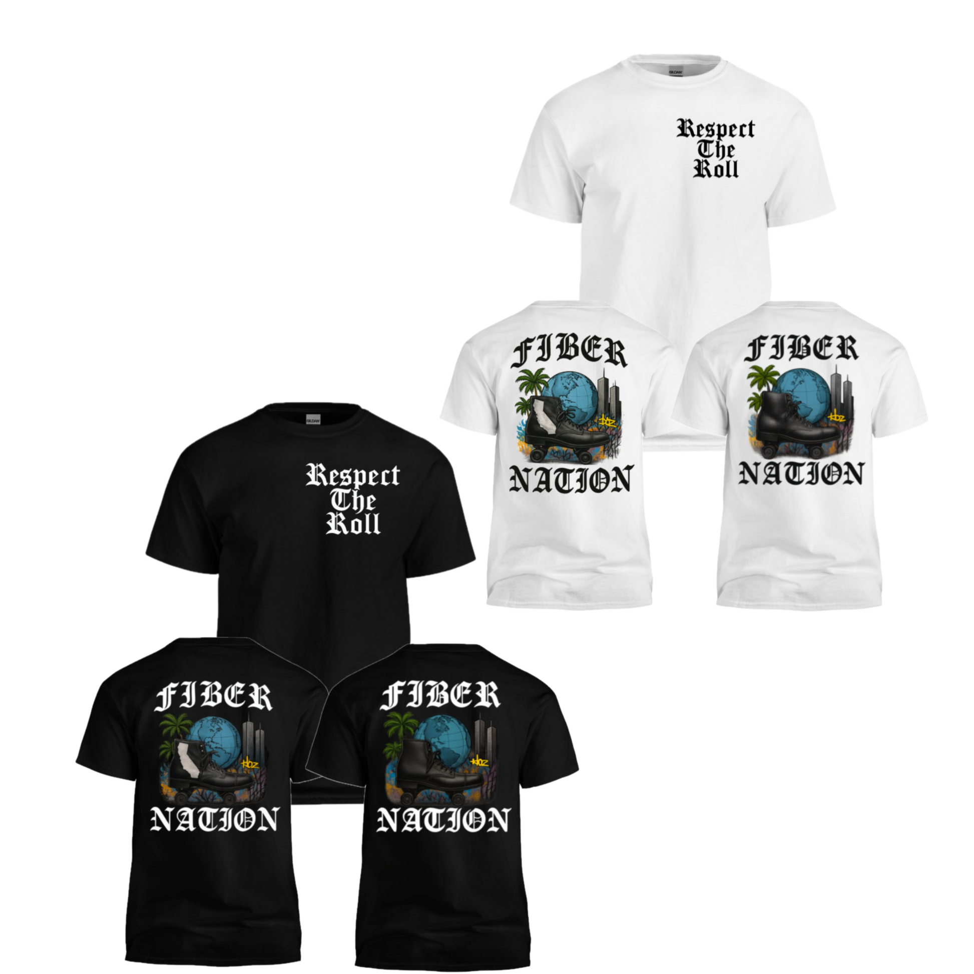 Pictured is our "Respect the Roll" cotton, classic and durable fit t-shirt. The front features the text "Respect the Roll" while the back depicts that California fiber life with the words "Fiber Nation" separate by a California depiction graphic.